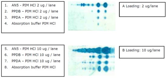 PIMs were also identified in the antigenic preparations PPD-A and PPD-B. These extracts are known to encompass cross-reactive components that inhibit test specificity []. Several cross-reactive proteins were identified [,], but the nature of most cross-reactive components is unknown. Since antibodies are non-specifically generated against PIMs, this indicates they are cross-reactive agents that impair serological test specificity. To enhance the specificity of serological tests, a pre-absorption step was used to filter out the majority of cross-reactive agents by incubation with an absorption buffer. Indeed, immune TLC showed that the M. phlei absorption buffer comprised PIM antigens to which PIM antibodies present in MB infected serum bind. Although pre-absorption greatly improves the specificity of ELISAs, false-positive results have still been reported in areas with high prevalence of environmental bacteria, including southern and south-eastern United States []. This indicates that the occurrence of false-positives and concordant test specificity greatly depends on location.