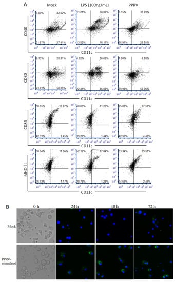 Confirmation of peste des petits ruminants virus (PPRV) interaction with bone marrow-derived dendritic cells (BMDCs). (A) BMDCs were treated with LPS (100 ng/mL) and PPRV (300 μL/L × 106 cells), the levels of CD80, CD40, CD86 and MHC-II were detected by flow cytometry; (B) PPRV-N protein can be detected through green fluorescence in the PPRV-stimulated group vs. mock in indirect immunofluorescence assay.
