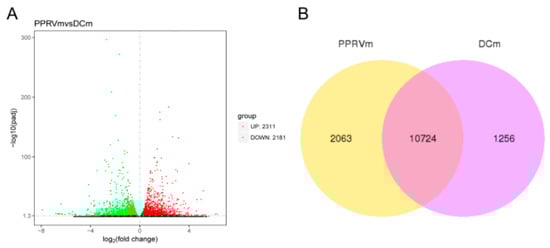 Differential expressed genes (DEGs) in response to PPRV. (A) Volcano map of DEGs. Red dots represent upregulated genes, and green dots show downregulated genes. The abscissa indicates variation in gene expression between different samples (log2 Fold Change), and the ordinate indicates the significance of the expression differences (−log10 padj). (B) Venn graph of DEGs.