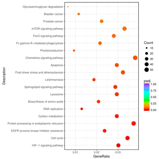 The harvested cells were centrifuged at 1500 rpm for 10 min and stored at −80 °C for RNA extraction. RNA concentration was measured using a Qubit RNA Assay Kit and a Qubit 2.0 Fluorimeter (Life Technologies, Karlsbad, CA, USA). A total amount of 3 µg RNA per sample was used as input material for the RNA sample preparations. Then RNA integrity was assessed using the RNA Nano 6000 Assay Kit of the Bioanalyzer 2100 system (Agilent Technologies, CA, USA). Sequencing libraries were generated using an NEBNext Ultra RNA Library Prep Kit for Illumina according to manufacturer’s recommendations. Clustering of index-coded samples were performed on a cBot Cluster Generation System using TruSeq PE Cluster Kit v3-cBot-HS according to the manufacturer’s instructions [,]. After cluster generation, the library preparations were sequenced on an Illumina platform, and 125 or 150 bp paired-end reads were generated.