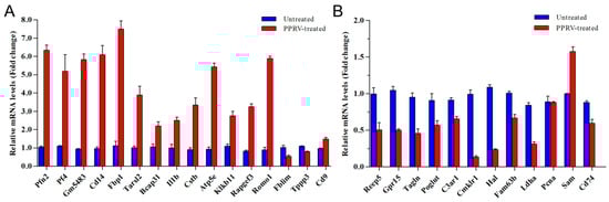 Additionally, apoptosis pathways are related to cell death, which can also be thought of as one of the defense mechanisms for virus replication. Ctse and Cd9 were related to the innate immune system, but only Bcap31 regulated apoptosis. Bcap31 was investigated to determine its involvement in CASP8-mediated apoptosis [,]. PPRV infected with goat-PBMCs induced apoptosis, which implied that virus replication could be inhibited by killing cells []. In addition, apoptosis was related to interactions between viruses and the host immune system []. Hence, we observed the significantly upregulated Bcap31 transcript, indicating that PPRV interacted with BMDCs to induce apoptosis in cells to some extent. Additionally, Plcb1 played an important role in cell signal transduction, while most of the other proteins were glycoproteins related to actin synthesis, proteolysis and metabolism. At the transcriptional level, this gene was upregulated and accounted for the majority. This suggested that the abundance of genes involved in these pathways was less affected by PPRV. We selected a few genes that we were interested in to detect mRNA levels through qRT-PCR, which showed identical results to transcriptome sequencing analysis. Thus, our findings might help elucidate the cellular events that occurr in BMDCs following PPRV stimulation.