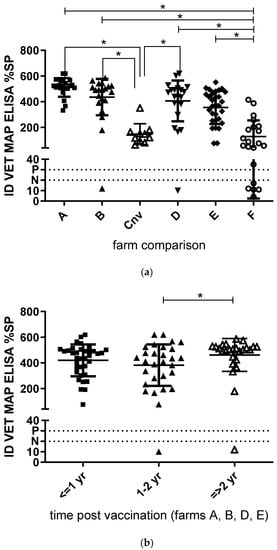 - Luttikholt, S.; Lievaart-Peterson, K.; Gonggrijp, M.; Aalberts, M.; van Schaik, G.; Vellema, P. Mycobacterium avium subsp. paratuberculosis ELISA Responses in Milk Samples from Vaccinated and Nonvaccinated Dairy Goat Herds in The Netherlands. Vet. Sci. 2019, 6, 58. [Google Scholar] [CrossRef]