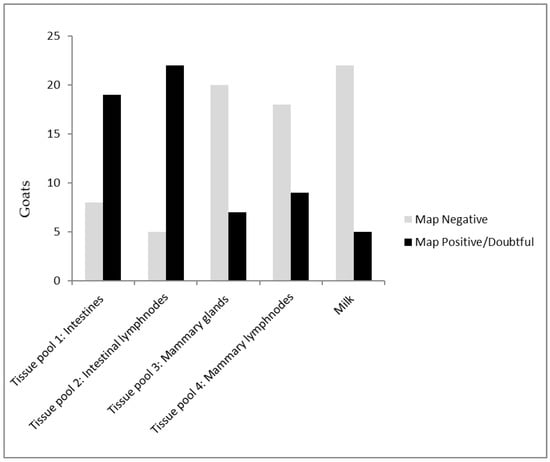 - Post mortem collected milk samples (n = 27) from goats designated to be slaughtered from three herds (herd B, G, and H). These goats were selected by the dairy goat farmers based on clinical signs consistent with paratuberculosis and were euthanized on farm by the local veterinarian. After euthanisation, the cadavers were transported to the post mortem facility at GD-Animal Health. Milk samples were collected by milking both udder halves separately after disinfection and removal of the first milk. In addition, tissue samples were collected from the distal ileum, mid jejunum, ileocecal valve, draining mesenteric lymph nodes, as well as bilateral mammary tissue, and mammary lymph nodes. For each individual, four pooled tissue samples were created, consisting of samples from the intestines (distal ileum, mid jejunum, ileocecal valve), the draining mesenteric lymph nodes, bilateral mammary tissue, and the bilateral mammary lymph nodes, respectively.