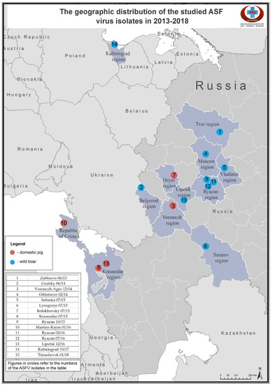 Figure 1. The geographic distribution of the studied African swine fever (ASF) virus isolates in 2013–2018.