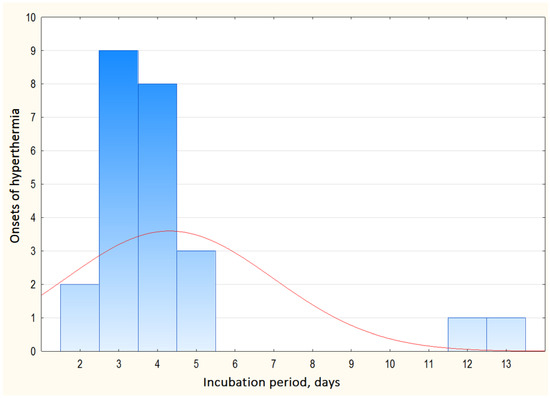 Figure 2. Distribution of the duration of incubation periods for studied isolates (first case of hyperthermia in any of the infected pigs).