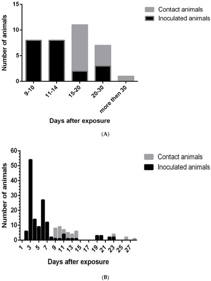 Antlibodies were present in blood of some pigs. They were usually detected at 9–14 d.p.i., usually a few days before the death of the animal (Figure 2). In contact animals, antibodies were produced at 15–20 days after beginning of the experiment. It indicates the rapid replication of the virus in inoculated animals and the onset of virus shredding. The formation of immunoglobulins in a detectable amount happened in the least “physiological time” (7–9 days).