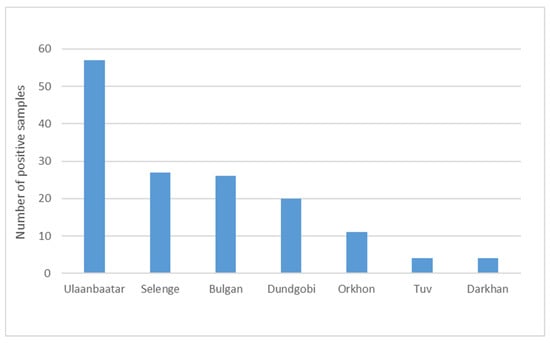 Total number of African swine fever positive samples by province obtained between 8 January and 9 February 2019 in Mongolia.