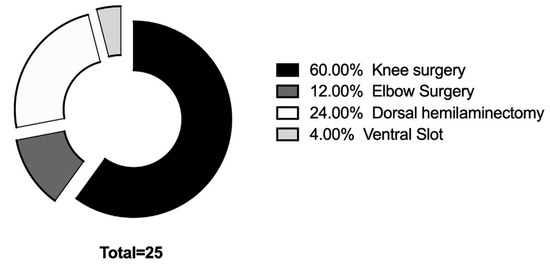 Twenty-five dogs (fifty eyes) were included in the study. The average age was (Mean ± SD) 59.16 ± 28.09 months; the median weight was 10.55 kg (4–45 kg). There were 16 males and nine females. Median anesthesia time was 137 min (range 75–242 min). Distribution of surgical procedures was reported in Figure 2. No statistically significant differences were found among groups. for the duration of anesthesia (p = 0.134).