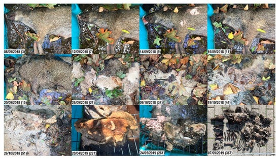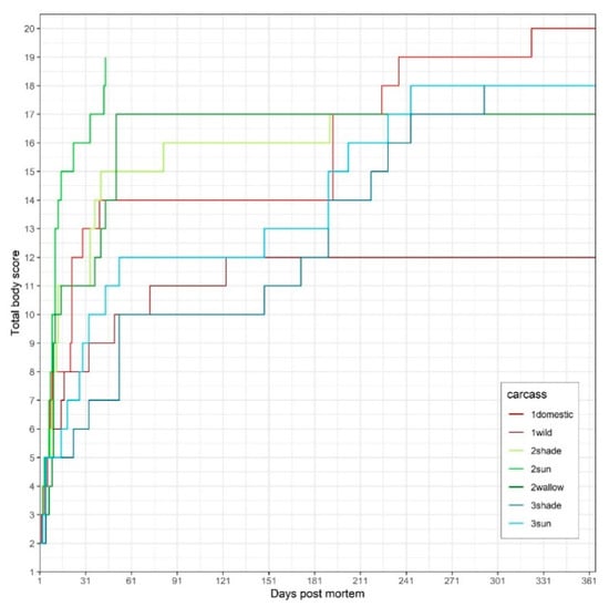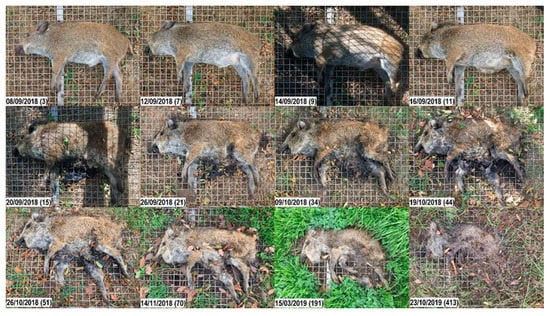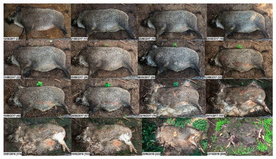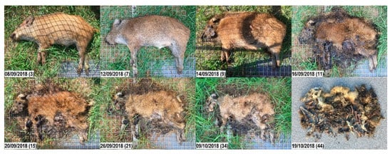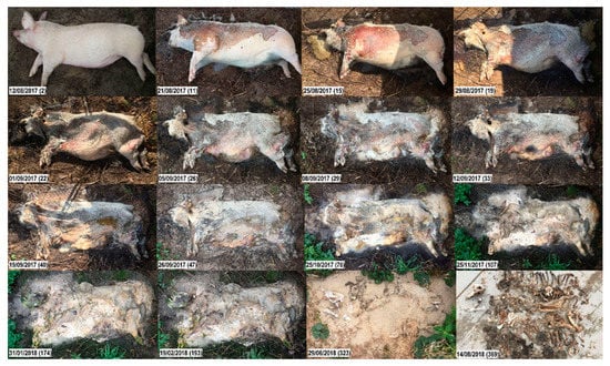 In the event of an outbreak of African swine fever (ASF), the time of disease introduction and the extent of the affected area need to be assessed. It is therefore necessary to estimate the time that has elapsed since the death of a wild boar (Sus scrofa) found in the field, i.e., the postmortem interval (PMI). For domestic pigs (Sus scrofa domesticus), comprehensive forensic research has been undertaken [], but little is known about the decomposition process of wild boar, and no systematic guidelines for PMI estimation have so far been available.