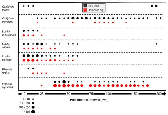 Insect succession on carcasses 1domestic (red) and 1wild (black) from Day 10 (20 August 2017) to Day 250 (17 April 2018) post-mortem. The abundance of the blowflies C. vicina, C. vomitoria, L. ampullacea, L. caesar, L. sericata and P. regina as well as of the piophilid P. nigriceps is shown by circles of different sizes representing the approximate number of specimens on the carcasses.