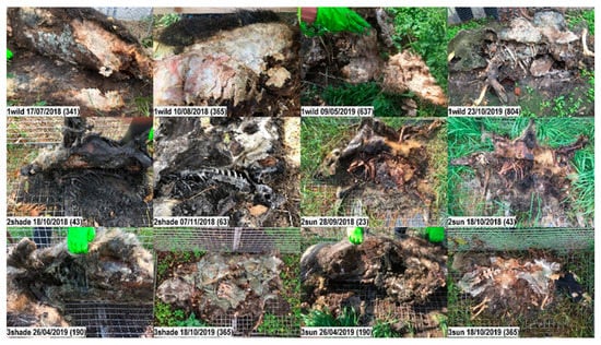 Decomposition of carcass 2sun. Top to bottom, left to right; numbers in brackets represent the days post-mortem. Early decomposition. Day 3: Still no visible swelling. Day 7: Extensive maggot activity on snout, eyes, and anus; moist decomposition of the head; abdomen bloated. Advanced decomposition. Day 9: Mummification of the head has started; extensive maggot activity over the whole body; abdominal tissues enter the stage of moist decomposition. Day 11: Skin has dried; head starts to skeletonize; reduced number of maggots; clear decrease in biomass. Day 15: Most soft tissues have gone; remaining tissues are black and sticky. Day 21: Further loss of soft tissues. Otherwise, not many changes are noticed. Skeletonization. Day 34: Bones easily palpable under the skin. Day 44: Dry bones, desiccated skin and bunches of sticky bristles left.