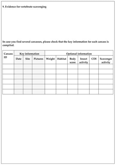 Proposed checklist for a wild boar carcass found in the field. The “key information” section includes the date and site of finding as well as the instruction to take photographs. Taking photographs is a simple and useful [] technique for illustrating what the carcass looked like and where it was found, e.g., in the forest, near a road or a lake. The place of discovery cannot only give clues about the PMI, but also about the mode of disease introduction and spread.