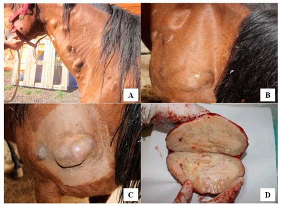 A 12year-old Quarter Horse mare, born and housed in southern Italy (Reggio Calabria) as a companion animal was presented because of diffuse subcutaneous nodules and masses. Lesions ranged from 2 × 3 (Figure 1A) to 5 × 20 cm (Figure 1B) and were mainly localized at shoulder and neck regions. Through cytology, a pyogranulomatous condition was diagnosed and a first treatment with penicillin (10,000 IU/kg) and dihydrostreptomycin (7.5 mg/kg) intramuscularly, once daily, for two weeks was given but without any improvement or disappearance of lesions []. Due to worsening of the clinical condition over this period that included weight loss, lethargy, and ocular discharge, 3 masses were surgically removed and a third-generation cephalosporin (Ceftiofur: 2.2 mg/kg b.w.) and tetracycline (5 mg/kg intravenously once daily) were administered for 10 consecutive days. The excised masses were sent to the Unit of Pathology, Department of Veterinary Sciences, University of Messina (Italy), for histological examination. Macroscopically, the excised masses appeared well-vascularized and adherent to the subcutaneous tissues and underlying muscles. On cross section, fibrous connective tissue surrounded a caseous and necrotic material with dispersed small multiple purulent-like foci (i.e., pyogranulomas) (Figure 1C,D).