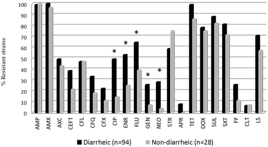 Antimicrobial resistance of E. coli strains from diarrheic and non-diarrheic groups. * Statistical differences between diarrheic and non-diarrheic animals (Fisher exact test p < 0.05). Antibiotic abbreviations are shown in Table 1.