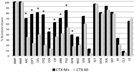 Percentage of E. coli resistant strains to different antimicrobial categories according to CTX-M gene expression. * Statistical differences between CTX-M+ (positive) and CTX-M– (negative) strains (Fisher exact test p < 0.05). Antibiotic abbreviations are shown in Table 1.