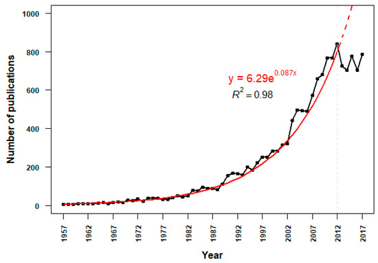 The Scopus search resulted in 14,113 articles with publication years ranging from 1957 to 2017. The publication growth could be approximated (R2 = 0.98, n = 55, p < 0.001) by the exponential function (), with the number of publications doubling every 7.97 years. The exponential growth continued until 2010, after which the number of retrieved publications did not further increase consistently (Figure 1).