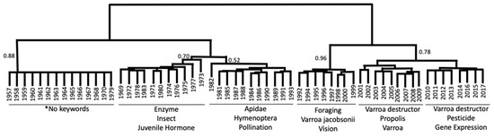 Although the year 2006 was not the most significant split in the cluster analysis, the network graphs (Figure 3 and Figure 4) indicated connections between CCD and the genome release. For example, our post-2006 keyword network showed the co-occurrence of words related to genomic tools (RT-PCR and genome) and health (virus and immunity), which suggested that genomic tools were increasingly used to study honey bee health-related topics [14,53,54]. For example, genomic tools such as gene expression analysis facilitated understanding disease susceptibility, social immunity mechanisms, and response to environmental stressors [55,56]. Similarly, sequencing and RT-PCR have helped to sequence and detect pests and pathogens that impact honey bee health [14,57,58].