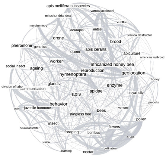 The co-occurrence of author-assigned keywords was explored using network analysis (Figure 3 and Figure 4). The abundance of connections in both networks (pre- and post-2006), showing greater than randomly expected co-occurrence, indicated that many keywords were grouped and did not occur randomly. In part, this might be explained by the paucity of keyword usage in the early years of our dataset. However, tight clusters of correlated keywords, such as the clusters related to pollination (“crops”, “flowers”, “nectar”, and “pollination”), colony products (“pollen”, “honey”, “royal jelly”, “venom”, and “propolis”), and taxonomical classifications (“insect”, “hymenoptera”, “bees”, “apis mellifera subspecies”, “apis cerana”, and “africanized honey bee”) were likely reflecting true connections. Overall, our findings indicated that core research related to apicultural science remained unchanged in both time periods. Words like “geolocation” (the term assigned to refer to geographical locations and environmental factors) acted as a connector between different research foci in both time periods, indicating that the interaction between the honey bee and the environment was related to many other concepts regardless of time period [51,52].