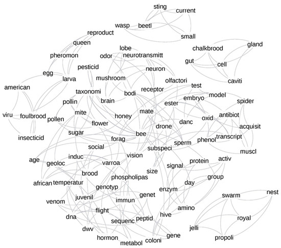 The top five relevant words from each topic were used to create networks to shed light on the overall patterns of the co-occurrence and interconnection of computer-generated keywords before and after 2006 (Figure 5 and Figure 6). The top five words from each topic were automatically connected to each other and formed a small sub-cluster. These small sub-clusters could be connected to each other through common words among themselves, forming larger clusters in the graph. For example, in Figure 5, words such as “bee”, “forage”, “dance”, “test”, and “model” from Topic 1 formed a small sub-cluster, which was connected to the small sub-cluster formed by the words “bee”, “coloni”, “hive”, “day”, and “group” from Topic 2 through the common word “bee” and even making a larger cluster by connecting to Topics 3, 4, and 16 by the same common word. Visual inspection revealed that important research connections in specific sub-fields were formed post-2006 as the field matured and new knowledge was gained. For example, the term “queen” was connected to only a few reproductive-related terms such as words “queen”, “reproductive”, “pheromon”, “larva”, and “egg” in the pre-2006 network (Figure 5), while neglecting the role of some important terms such as “drone” and “sperm”, which appeared in the later time period (Figure 6). Further, we observed more small independent clusters not connected to the rest of the network post-2006 (Figure 6): for example, a cluster with words “brain”, “neurotransmitt”, “fli”, “function”, and “receptor” and another cluster with “mite”, “varroa”, “destructor”, “neonicotinoid”, and “pesticid” were not connected to the rest of the network, indicating more specialized research areas in the later time period.