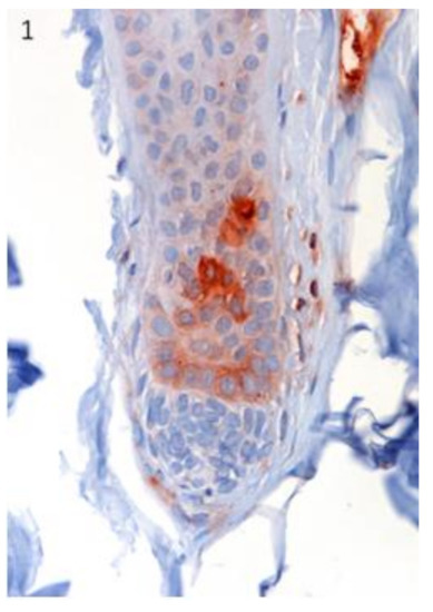Permanently residing adult stem cells have been recognized in normal skin, and these are able to sustain three principal differentiated lineages: the interfollicular epidermis (IFE), the sebaceous glands (SGs) and the hair follicles (HFs), thus maintaining skin structure and integrity [6]. In canine skin, several stem cell markers, including CD34, CK15, follistatin, CD200, Lgr5, Lgr6 and Sox9 [7,8,9,10,11,12], have been investigated and demonstrated to have similar expression profiles as human and mouse HF SC markers.