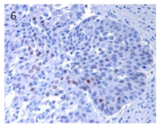 Sox9 mRNA expression was observed in both BCC and SCC, but it showed a significant downregulation compared with normal skin. When the pattern of distribution of the protein was analysed, about 50% of the cases of SCC (5/9) and BCC (3/6) showed positive cells (Table 1). In the stained SCC samples, Sox9-positive cells were mainly present in the neoplastic cells showing basal cell morphology (Figure 4), in infiltrating areas, and with a high level of expression (25%–50% of positive cells) in the specific SCC histotype known as basosquamous carcinoma (Figure 5). A patchy distribution of immunostaining was observed in the positive BCC cases (Figure 6).