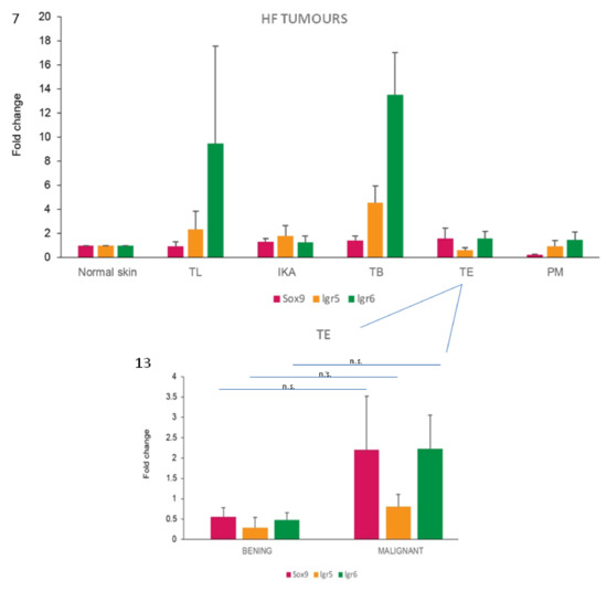 In order to understand if the investigated HF stem cell markers could have a potential role as prognostic markers in these types of skin tumours of the dog, differences between benign and malignant tumours were analysed for both protein and mRNA expression. However, the majority of the malignant tumours included in the present work were epidermal tumours, resulting in bias in the distribution of malignant tumours in our case series. So, we limited the comparison to the TE group. A tendency towards an increase of Sox9 and Lgr6 mRNA expression in malignant TE was observed compared with benign cases (Figure 13).