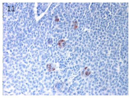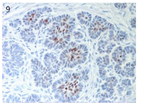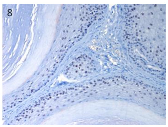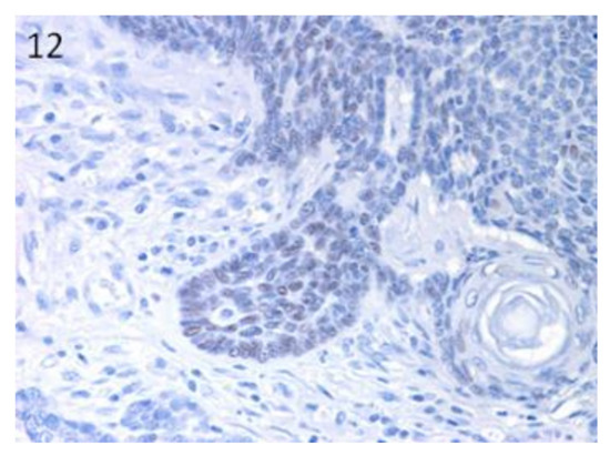 Sox9-positive cells were mainly present among the basaloid neoplastic cells of infundibular keratinizing acanthoma (Figure 8). The immunolabelling was evident in the inner parts of the nests of the TB, in both ribbon (Figure 9) and trabecular types, while only scattered positive nuclei were evident in the TL samples (Figure 10). In the PM cases, neoplastic cells with matrical cell morphology were negative; however, single or small clusters of positive cells were evident among these negative matrical cells (Figure 11). A heterogeneous expression pattern based on the predominant hair follicle differentiation was observed in TE samples (Figure 12), with no difference between the benign and malignant forms.