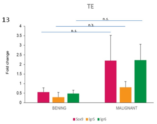 Sox9 and Lgr6 mRNA are potential markers of malignancy in TE tumours. mRNA expression of Sox9, Lgr5 and Lgr6 in TE cases. When the average values of benign and malignant cases were compared within the TE group, differences were present for all the three markers. Two-tailed t-test: Sox9, not significant (n.s.) (p = 0.379); Lgr5, n.s. (p = 0.269); Lgr6, n.s. (p = 0.150).