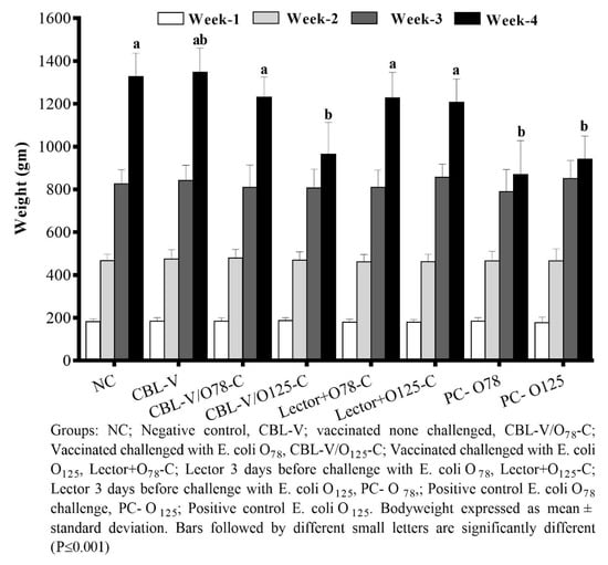 The differences in the mean bodyweight, E. coli reisolation rates, and lesion scores were estimated by one-way analysis of variance (ANOVA) followed by Tukey’s multiple comparisons test using GraphPad Prism version 7.00 (GraphPad Software, San Jose, CA, USA, www.graphpad.com).