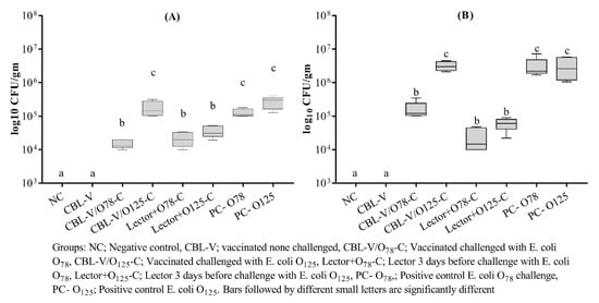 The mortality rate in the heterologous challenge with APEC O125 (CBL-V/O125-C group) was 28%, which is comparable to the challenge control group (32%) of this serotype. Additionally, clinical and lesion scores were higher compared to the negative control groups. The performance parameters and the detection of APEC O125 challenge strain in both vaccinated challenged and challenge control groups were almost the same []. These results indicate the failure of the attenuated E. coli derivatives (deleted gene mutants) to protect against heterologous challenge [,] confirming Kariyawasam and co-workers’ finding that the protection conferred by mutant E. coli vaccine is serogroup specific [].