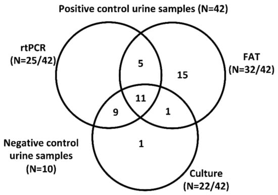 Venn diagram of test-positive bovine urine samples (N = 42 total). Numbers of bovine samples which were positive for Leptospira by FAT and/or culture and/or rtPCR are provided. Only 26% (11/42) samples were considered positive by all three assays.