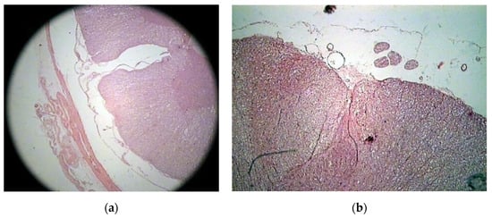 Histologic study executed on a cat’s spinal cord. Hematoxylin–eosin 2.5X, showing the perfect anatomical integrity of the spinal cord and dura after piezoelectric osteotomy (a,b).