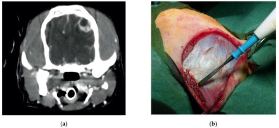 Dog, female, crossbreed, six years old, 14 kg, who suffered from seizures due to a suspected left intracranial parietal meningioma. She underwent a lateral rostro tentorial craniotomy with the piezoelectric bone scalpel. No dura mater sinus was present. The scalpel was essential in sparing the underling dura and brain. The tumor was completely removed, and recovery was complete, without complications (Figure 6).