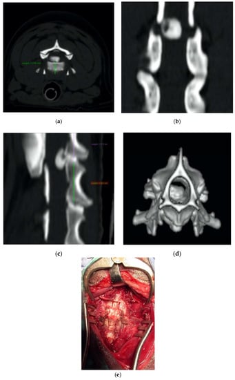 Axial (a), coronal (b), sagittal (c), and 3D (d) cervical CT scan showing a C2-C3 disk extrusion in a seven-year-old dachshund suffering from a progressive tetraplegia. Ventral slot decompression was obtained by means of long angled large saw tip (OT7, Osteotomy Tips Kit, Mectron Medical Technology, Genoa, Italy) (e).