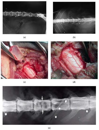 X-ray in latero-lateral (a) and ventro-dorsal (b) projection, showing multiple retained lead shots in a cat paraplegic because victim of a firearm trauma. One of the intrathecal lead shots caused a spinal cord contusion and partial compression. A subdural hematoma was also present. Intraoperative pictures showing lumbar spinal cord after decompressive one-level laminectomy performed with piezoelectric scalpel and an angled small saw tip (OT7S-3, Osteotomy Tips Kit, Mectron Medical Technology, Genoa, Italy) (c,d). Six-months postoperative ventro-dorsal X-ray showing the site of the laminectomy (e).