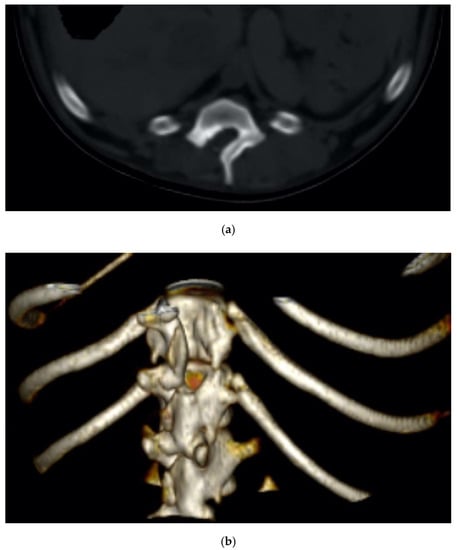 Two-dimensional (a) and 3D (b) CT scan of an explicative case of dorsal hemilaminectomy performed in a dachshund diagnosed with a spinal cord compression.