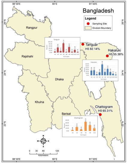 The grouping of the HA sero-subtype distribution by the sampling site demonstrated that both hoars were the most infected hub by H5 and H9 in comparison to other sites. The following was found: 39.1% (9/23) in Hakaluki haor vs. 100% (17/17) in Tanguar haor vs. 100% (1/1) in Chattogram for H5 and 52.2% (12/23) in Hakaluki haor vs. 58.8% (10/17) in Tanguar haor vs. 100% (1/1) in Chattogram for H9 in migratory birds; 100% (1/1) in Hakaluki haor vs. 100% (3/3) in Tanguar haor vs. 62.5% (20/32) in Chattogram for H5 and 0% (0/1) in Hakaluki haor vs. 33.3% (1/3) in Tanguar haor vs. 31.3% (10/32) in Chattogram for H9 in resident wild birds; 86.7% (13/15) in Hakaluki haor vs. 69.6% (16/23) in Tanguar haor vs. 0% in Chattogram for H5 and 33.3% (5/15) in Hakaluki haor vs. 39.1% (9/23) in Tanguar haor vs. 0% in Chattogram for H9 in nomadic ducks; 50% (11/22) in Hakaluki haor vs. 76.9% (10/13) in Tanguar haor vs. 61.5% (8/13) in Chattogram for H5 and 18.2% (4/22) in Hakaluki haor vs. 53.8% (7/13) in Tanguar haor vs. 53.8% (7/13) in Chattogram for H9 in household ducks. It was found that sero-subtypes H1, H2, H3, H4, H6, H8, H10, H12, H13 and H16 were detected across the study sites in different bird types (Table 3).
