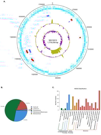 General features of the WH13013 complete genome. (A) Circular map of the complete genome of WH13013 which was generated via DNAPlotter. From the outside to the inside, the circle 1 represents the DNA base position (bp); circle 2 (cyan-blue), protein-coding regions transcribed clockwise; circle 3 (cyan-blue), protein-coding regions transcribed anti-clockwise; circle 4 (cyan-blue), predicted RNA genes; circle 5 (red), predicted genomic islands; circle 6 (blue), predicted phages sequences; the two innermost circles represent G + C content and GC skew, respectively. (B) Pie chart showing the proportions of the genes encoded by the WH13013 genome localizing in different places of the cells. (C) Bar graph showing the number of genes being assigned into different KEGG classifications.