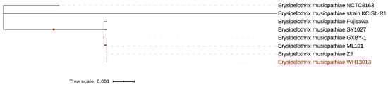 Currently, there are only 11 genome sequences of E. rhusiopathiae available on the NCBI and 8 of them are complete sequences. Phylogenetic analysis revealed that WH1303 was closest to E. rhusiopathiae strains ZJ (GenBank accession no. NZ_CP041995), ML101 (GenBank accession no. NZ_CP029804), and GXBY-1 (GenBank accession no. NZ_CP014861) [] (Figure 2). These four isolates from China were also close to E. rhusiopathiae strains Fujisawa (GenBank accession no. AP012027), which was isolated from Japan [], and SY1027 (GenBank accession no. CP005079), which was also isolated from China [] (Figure 2). These six isolates were far from E. rhusiopathiae strains NCTC8163 (GenBank accession no. LR134439), which was isolated from the United Kingdom, and KC-Sb-R1 (GenBank accession no. NZ_CP033601), which was isolated from South Korea.