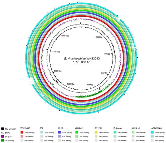 Comparisons of genomes related to WH13013. Shown is a BRIG circular plot for BLASTN comparisons of WH13013 and related genomes. The first and second inner rings represent the GC content and GC skew of WH13013, respectively. From the third ring inside, each ring corresponds to a different genome, as follows, from inner to outer ring: WH13013, ZJ, ML101, GXBY-1, SY1027, Fujisawa, KC-Sb-R1, and NCTC8163.