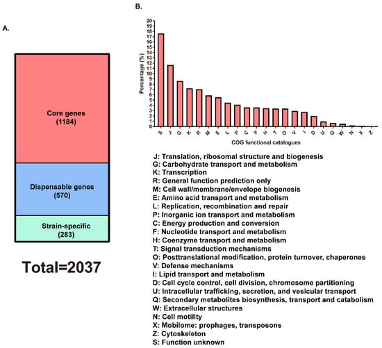 Distribution of core and dispensable genes among the eight E. rhusiopathiae virulent strains. (A) Distribution of core and dispensable genes. (B) COG functions of the core genes predicted.