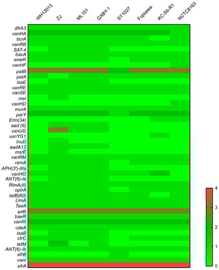 The prediction of antibiotic resistance genes using the complete genome sequences revealed that WH13013 contained genes conferring putative resistance to multiple drugs including trimethoprim (dfrA3), peptide antibiotics (bcrA, bacA), glycopeptide antibiotics (vanHA, vanRB, vanRE, vanSE, vanRM, vanHO, vanRI, vanI), fluoroquinolones (patB, patA, ramA, arlR, cdeA, efrA), β-lactams (smeR, ramA, efrA), cephamycins (smeR, ramA), aminoglycosides (smeR, baeR, ANT(6)-Ib), penams (smeR, ramA), fosfomycins (murA), aminocoumarins (parY), tetracyclines (ramA, optrA, tetB(60)), macrolide antibiotics (RlmA(II), optrA, cfrC, efrA), and phenicol antibiotics (optrA, cfrC) (Figure 5). The presence of these genes supports the phenotypes that WH13013 was resistant to tetracycline, cefazolin, lincomycin, gentamicin, kanamycin, sulfadiazine, and amikacin []. In addition, most of these resistance genes were also the broad characteristics of the other E. rhusiopathiae strains investigated in this study (Figure 5). Their presence may lead to treatment failure and contribute to the survival as well as the pathogenesis of E. rhusiopathiae.