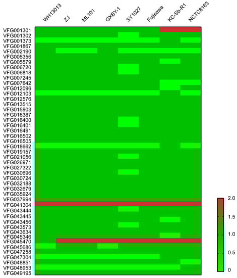 Our previous study has determined that WH13013 contained many known virulence factors coding genes (VFGs), including cpsA, cpsB, cpsC, spaA, rspA, rspB, hylA, hylB, hylC, nanH, pldB, a patatin-like phospholipase A coding gene (ERH-0072), a phospholipase D coding gene (ERH-0388), a putative adhesin coding gene (ERH-1356), a cardiolipin synthetase coding gene (ERH-0333), a patatin-like phospholipase B coding gene (ERH-0334), and a lysophospholipase C coding gene (ERH-1433) []. The products of these VFGs are involved in the biosynthesis of capsule (cpsA, cpsB, cpsC), neuraminidase (nanH), hyaluronidase (hylA, hylB, hylC), surface proteins (spaA), fimbriae, and other adhesions (rspA, rspB) [,]. The prediction of VFGs revealed that WH13013 also contained many another putative VFGs that contributed to the fitness and pathogenesis, including those others that participated in the biosynthesis of capsule (VFG001301, VFG001302, VFG002190, VFG048851, VFG007642, VFG016400), fimbriae, and other adhesions (VFG043444, VFG043445, VFG043634, VFG016502, VFG016505), as well as the other possible virulence factors such as the elongation factor Tu (VFG016491), iron uptake, and iron acquisition proteins (VFG007245) (Figure 6, Table S1 in Supplementary Materials). Most of these VFGs were also presented in other E. rhusiopathiae virulent strains (Figure 6), suggesting that these VFGs are important for the bacterial adaption and pathogenesis. Indeed, capsule plays a key role in the resistance to phagocytosis and intracellular survival of E. rhusiopathiae [,,]; surface proteins including fimbriae and other adhesions are as important in bacterial adherence to host cells during the infection []; iron is an essential element for bacterial survival and acts as an environmental signal that regulates the expression of many virulence factors [,].