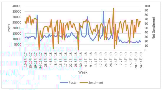 Weekly posts and net sentiment from September 2017 through November 2019.