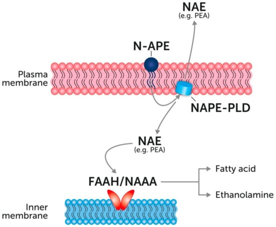 PEA, like other NAEs and related endocannabinoids, is synthesized and metabolized by different animal cell types and also present in plants, as recently reviewed by Petrosino and Di Marzo []. NAEs are biosynthesized from atypical phospholipids of cell membranes bearing three acyl chains (i.e., N-acyl-phosphatidyl ethanolamines, NAPEs), with the synthesis involving two enzymes, i.e., NAPE-generating Ca2+-dependent N-acyltransferase (Ca-NAT) and NAPE-hydrolyzing phospholipase D (NAPE-PLD) []. Like the other NAEs, PEA is produced "on demand" by most cells and its local levels are strictly regulated by balancing the activity of the biosynthetic and degradative metabolic pathways. The primary degrading enzymes are fatty acid amide hydrolase (FAAH) and N-acyl ethanolamine-hydrolyzing acid amidase (NAAA) [,] (Figure 2). Interestingly, PEA levels have been shown to change during stressful conditions. The first observation in this regard came from a study performed in dogs. It was found that the infarcted areas of canine myocardium contained substantial amounts of NAEs (about 20-fold higher than normal heart muscle), the main one being PEA. It was thus speculated that PEA was produced as a response to ischemic injury and might exert beneficial effects in the infarcted area []. Since then, several studies have characterized the changes in PEA levels during different pathophysiological conditions [,,]. For example, it has been shown that epidermal cells subjected to UV irradiation, which is known to induce cell damage, produce considerable amounts of NAEs, with PEA showing the highest increase []. Furthermore, in the lesional skin of privately owned dogs affected with atopic dermatitis, the levels of NAEs as well as those of the classic endocannabinoid, 2-arachydonoylglycerol (2-AG), were shown to be significantly elevated compared to normal non-atopic skin, with PEA levels showing the highest increase (more than 30 fold) []. A great deal of evidence suggests that PEA metabolism (i.e., the overall set of endogenous biosynthetic and degradative pathways) may be disturbed during certain disorders []. Accordingly, tissue levels of PEA are increased in several disease conditions and a decrease in PEA levels contributes to the disease development [,,]. The most commonly accepted hypothesis is that the synthesis of PEA increases when tissues face an actual or potential injury and serves as an early stop signal that contrasts the progress of inflammation []. Accordingly, one might argue that pathological situations may arise in which endogenous PEA levels are inadequate in dealing with the ensuing insult. In these cases, exogenous administration to effectively ‘top up’ the body’s own supply may be a viable approach [].