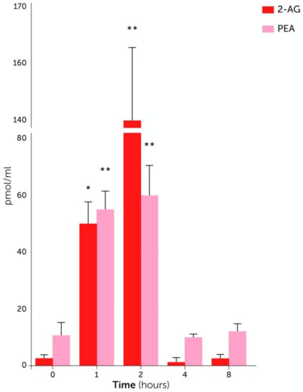 PEA (palmitoyl ethanolamide) entourage effect on 2-AG (2-arachydonoylglycerol). Following a single dietary supplementation with PEA-um to hypersensitive Beagle dogs, 2-AG plasma levels are significantly elevated, with a slight delay compared to PEA ones. * p < 0.05 and ** p < 0.001 versus time 0. Modified from [].