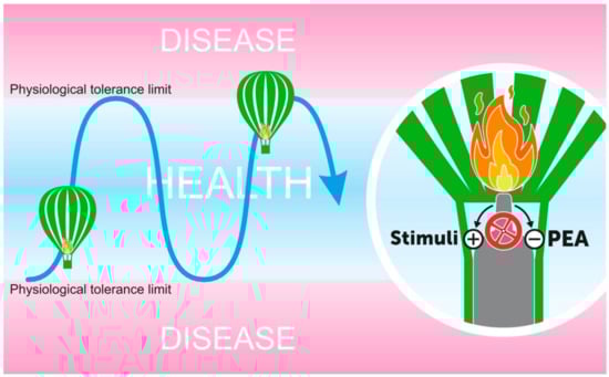Inflammation is a natural body response to harmful stimuli (e.g., pathogens, irritants) serving protective purposes. It is generally believed that a controlled inflammatory response is beneficial, but it can become detrimental if dysregulated, with uncontrolled inflammation being a key player in the pathogenesis of several diseases [,]. Therefore, inflammation must be finely tuned and switched off when no longer needed []. Accordingly, proinflammatory mediators, such as arachidonic acid derivatives, cytokines, and chemokines, should be finely counterbalanced by the so-called “proresolving” mediators, in order to limit inflammation and terminate the response once the threat has passed [,,]. It can be inferred that approaching such a complex process by targeting only one of the biochemical pathways might be a nonoptimal strategy. It is widely recognized that a multitarget approach is more effective, although difficult to achieve with medicinal products, given they usually act in a highly selective way, target a single mechanism, and are generally coupled with side effects as well as drug interactions. An alternative strategy that has been suggested is to commandeer nature’s own anti-inflammatory mechanisms and induce a “dominant” program of resolution []. Within this framework, PEA represents an interesting lipid signaling molecule. As outlined in detail in previous chapters, PEA is (i) produced “on demand” in response to tissue damage and/or an inflammatory response; (ii) able to downmodulate cell reactivity, especially at immune-inflammatory cells (i.e., ALIA effect); and (iii) active through a multitarget mechanism involving the prohomeostatic endocannabinoid system [,]. In line with this view, dietary supplementation of healthy animals with PEA resulted in a shift in the membrane lipid composition towards a proresolving lipid environment []. Therefore, dietary supplementation of PEA and congeners substantially overcomes the classical pharmacology view of “one drug, one target, one disease”, opening a whole new era in the management of animals’ health, i.e., an according-to-nature biomodulation of body responses to different stimuli and injury. A conceptual view of the prohomeostatic function of PEA is shown in Figure 4.