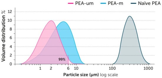 Particle size distribution profile of different PEA formulations. More than 99% and about 60% by weight of PEA-um has a particle size lower than 6 and 2 μm, respectively.