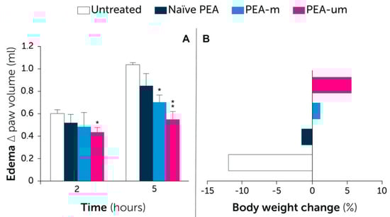 Superior activity of PEA-um compared to other PEA formulations. (A) Effect on inflammatory edema. Only the most relevant time points are depicted. See text for further details. * p < 0.05 and ** p < 0.01 vs. untreated group. Modified from []. (B) Effect on colitis-induced change in body weight. Modified from []. Naïve PEA: non-micronized PEA; PEA-m: micronized PEA; PEA-um: ultramicronized PEA.