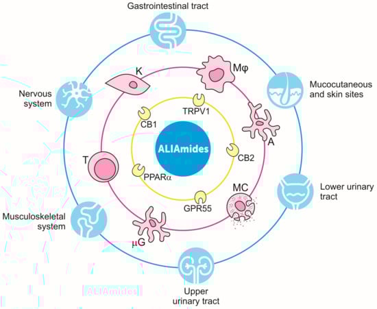 PEA and related amides belong to a class of physiological compounds, i.e., ALIAmides, commonly present in plants and animal food sources. Most ALIAmides are body-own components, locally produced “on demand” for homeostatic purposes. A great deal of evidence supports the proresolving function of endogenous PEA and related lipid amides. The multitarget actions of these natural bioacting compounds, their mutual interactions, and the close relationship with the endocannabinoid system are the key features for meeting the health needs of different body systems (Figure 7). The health-promoting effects resulting from the use of ALIAmides, provided they are administered in a bioavailable form, together with the safety and tolerability profile, led to the development of complementary feeds, PARNUTS, and topical products for the maintenance of heath in companion animals. The positive results obtained so far may encourage stronger efforts to further investigate the potential benefits arising from ALIAmides as a response to different animals’ needs, health, and wellbeing.